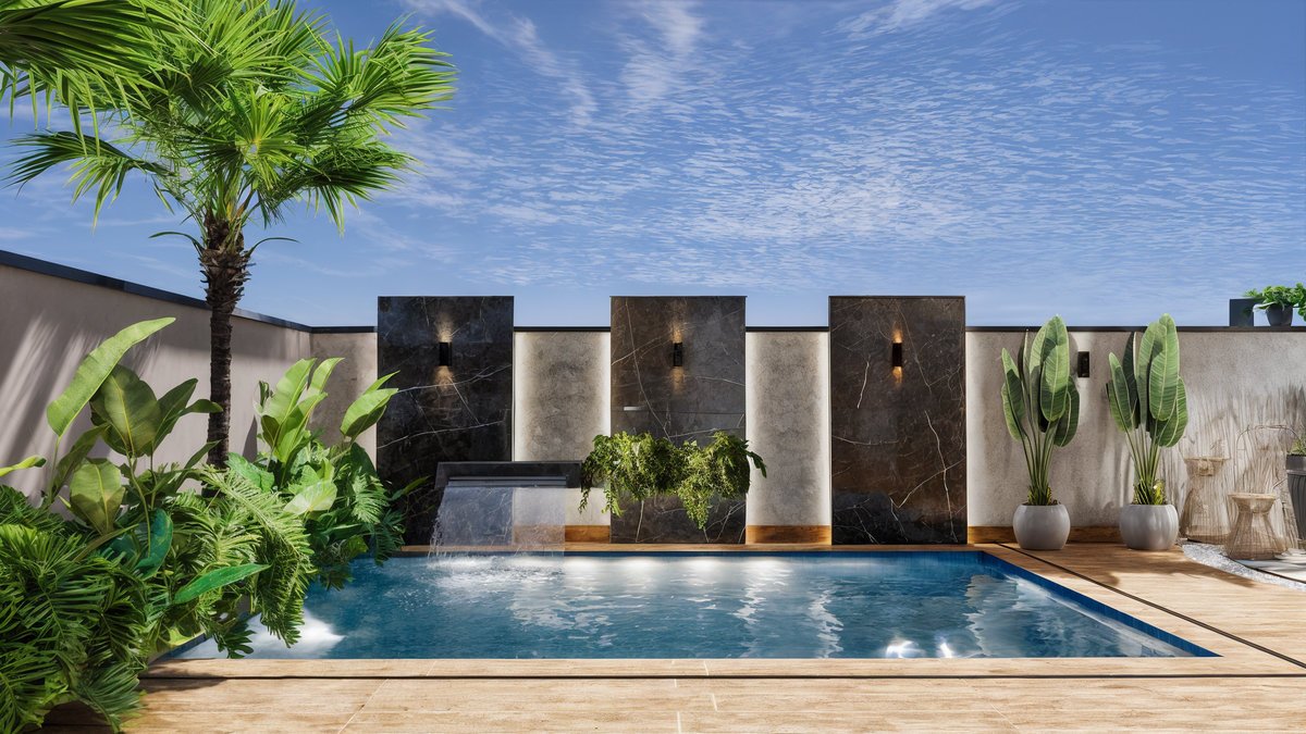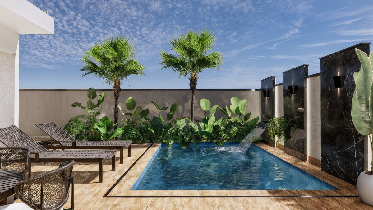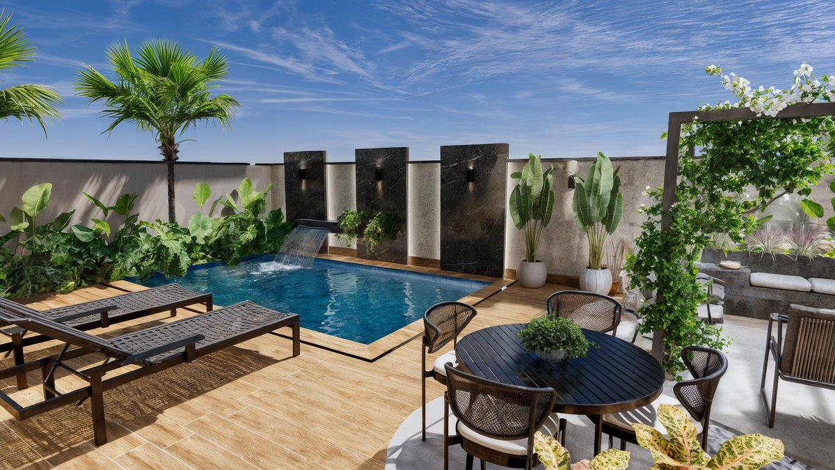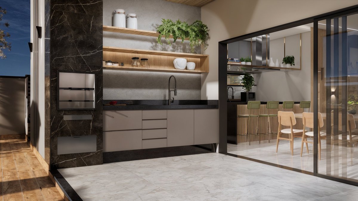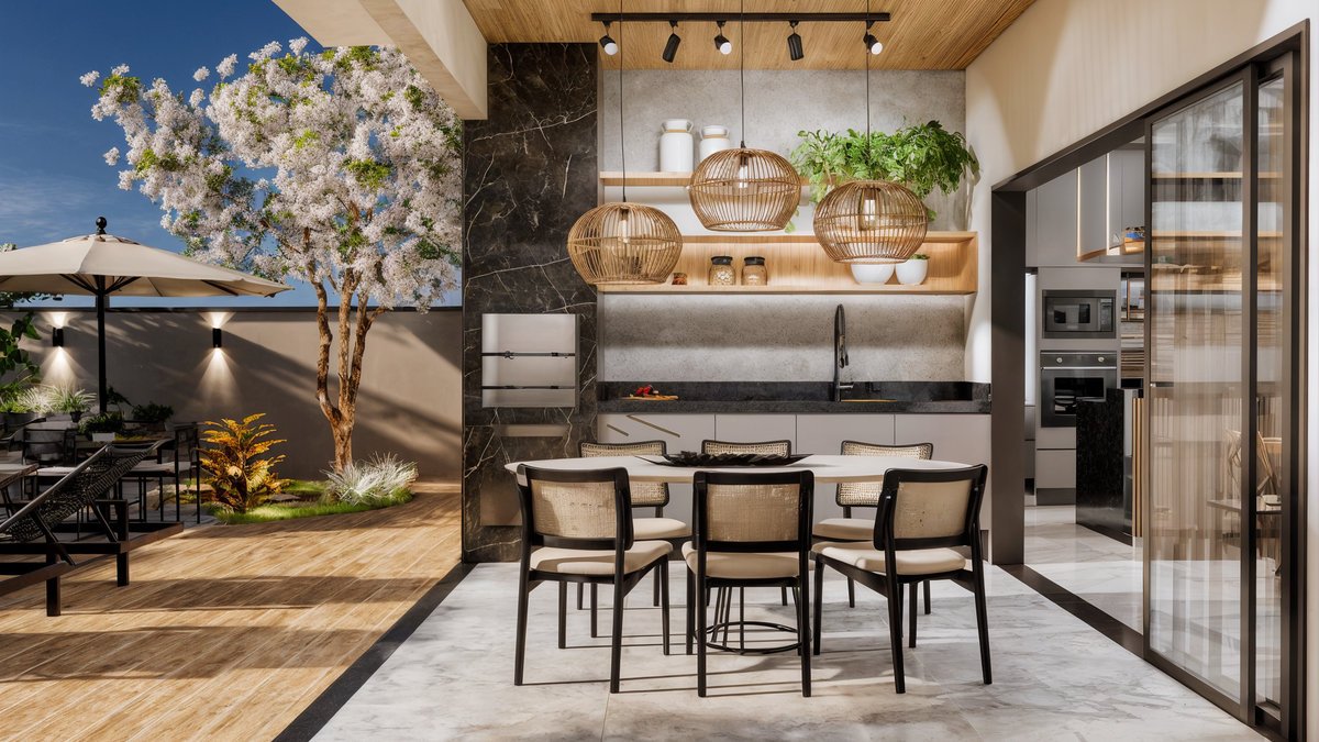 Piscina com cascata embutida em painéis de mármore preto, que trazem imponência e sofisticação ao fundo do jardim. Paisagismo tropical exuberante com palmeiras, bananeiras e folhagens densas, criando um clima de resort privativo. Pergolado com vegetação trepadeira e área de estar aconchegante, perfeita para receber amigos, com banco em alvenaria e lareira central. Espaço gourmet e refeições ao ar livre, Esse ambiente é o coração social do quintal — onde se compartilham sabores, histórias e bons momentos. Essa área gourmet foi projetada para oferecer conforto e praticidade nos momentos de convivência, conectando-se de forma fluida com a área externa e a cozinha principal da residência. A paleta de materiais mistura o natural com o sofisticado – madeira, pedras naturais, cimento queimado e vegetação abundante – criando uma atmosfera leve, contemporânea e totalmente integrada com a natureza.