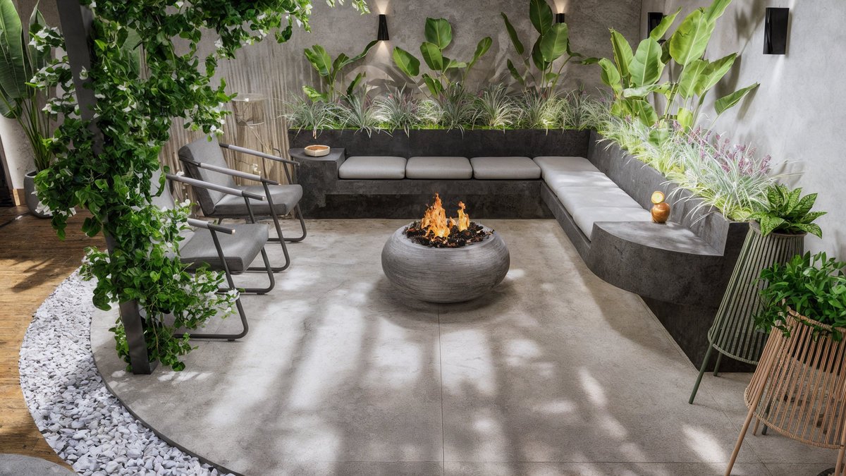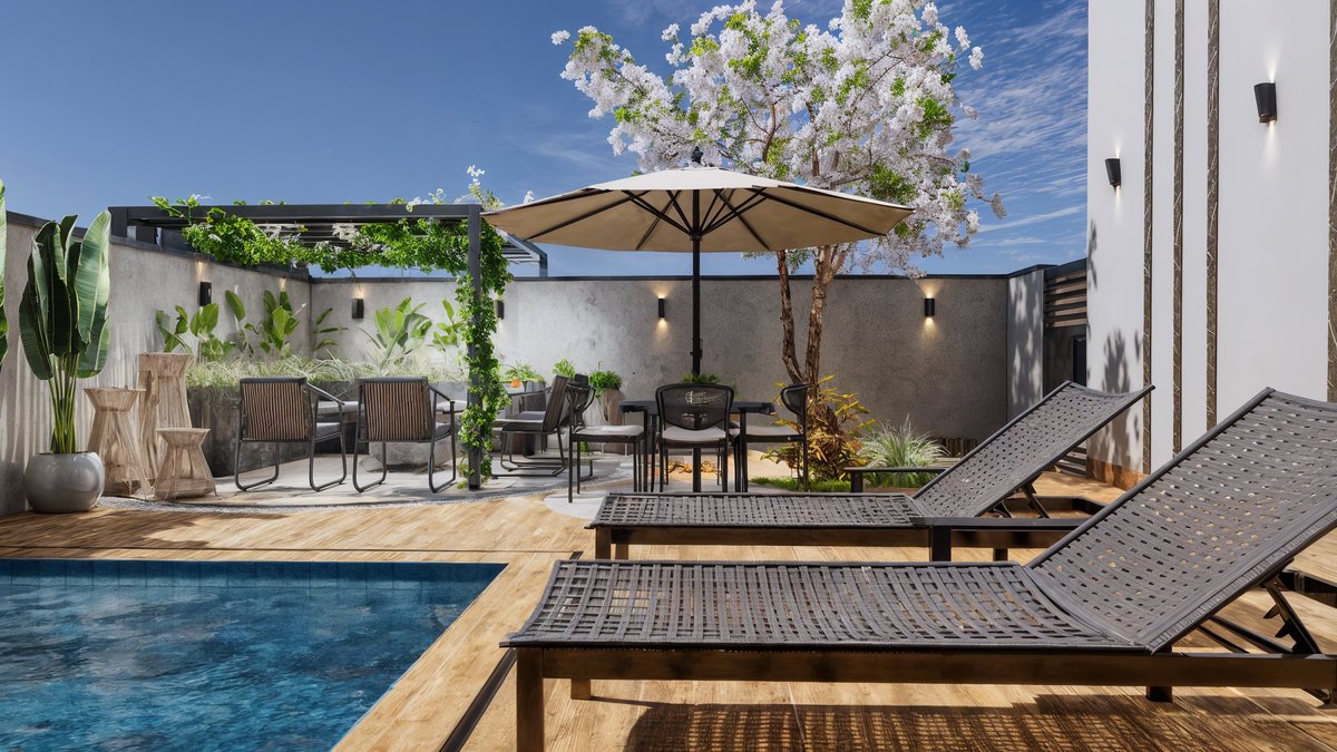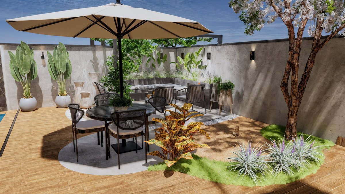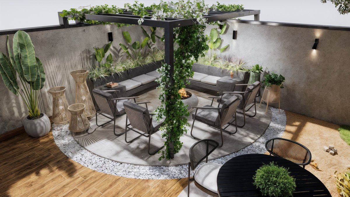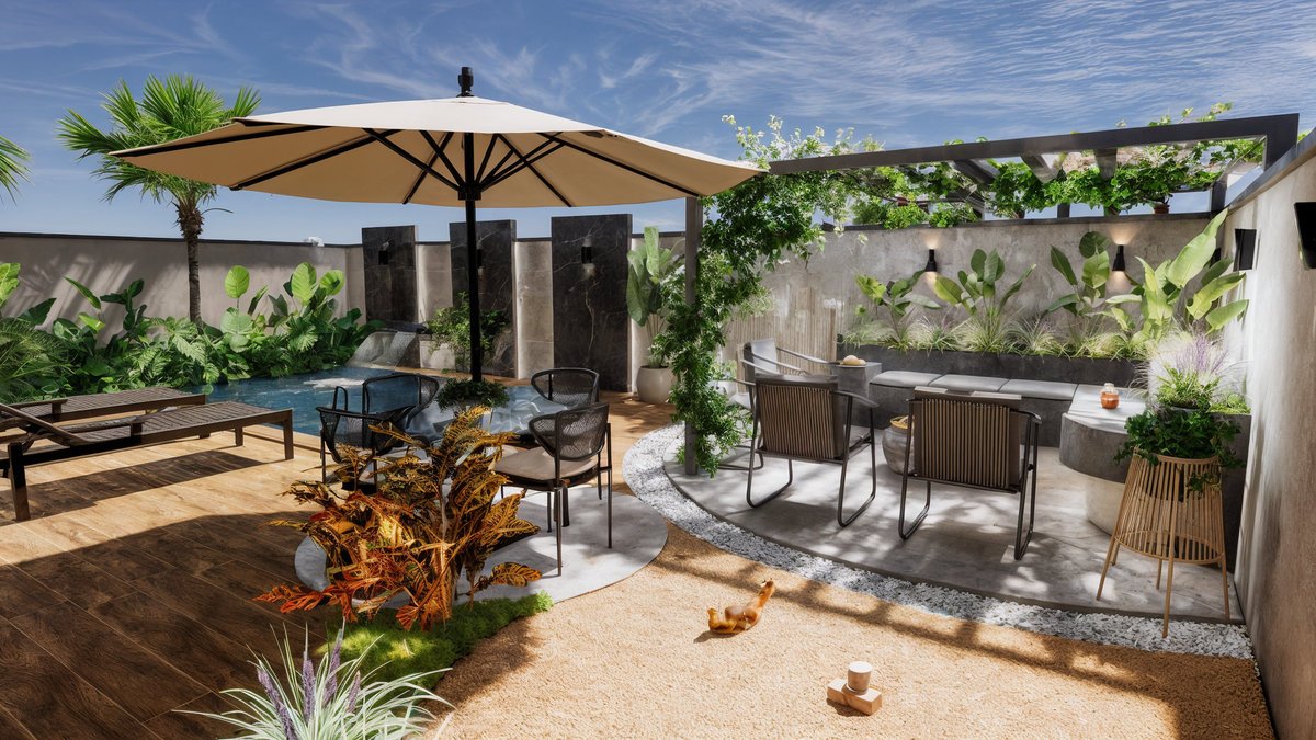Piscina com cascata embutida em painéis de mármore preto, que trazem imponência e sofisticação ao fundo do jardim. Paisagismo tropical exuberante com palmeiras, bananeiras e folhagens densas, criando um clima de resort privativo. Pergolado com vegetação trepadeira e área de estar aconchegante, perfeita para receber amigos, com banco em alvenaria e lareira central. Espaço gourmet e refeições ao ar livre, Esse ambiente é o coração social do quintal — onde se compartilham sabores, histórias e bons momentos. Essa área gourmet foi projetada para oferecer conforto e praticidade nos momentos de convivência, conectando-se de forma fluida com a área externa e a cozinha principal da residência. A paleta de materiais mistura o natural com o sofisticado – madeira, pedras naturais, cimento queimado e vegetação abundante – criando uma atmosfera leve, contemporânea e totalmente integrada com a natureza.