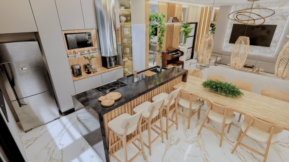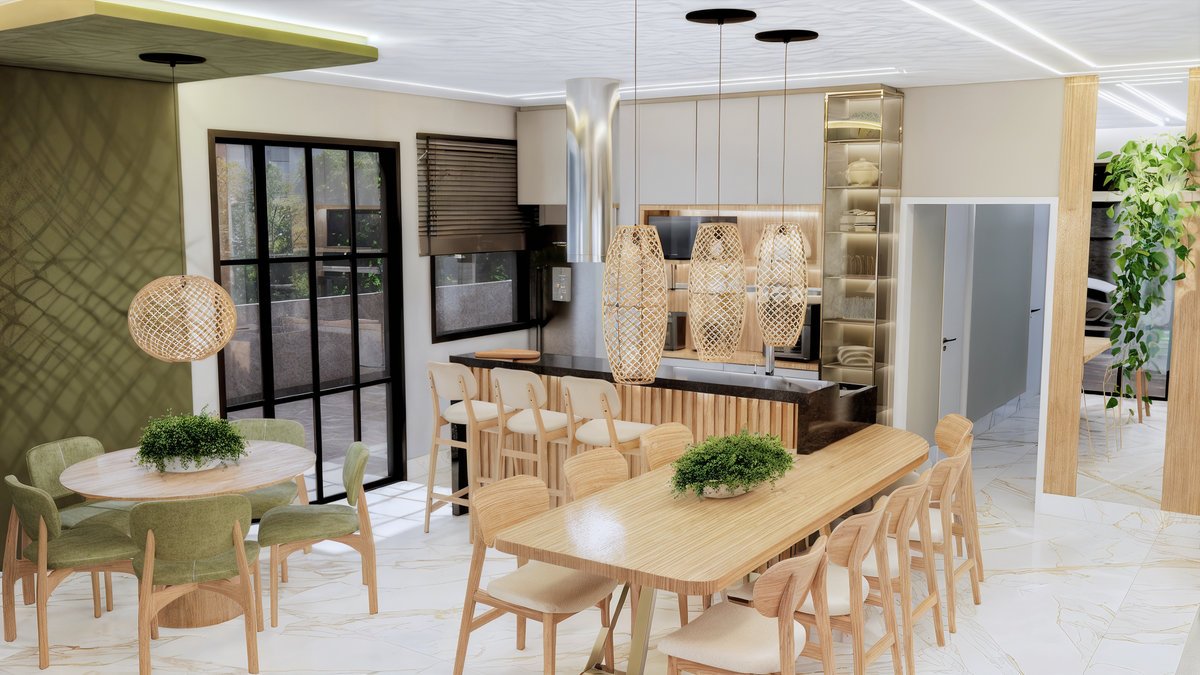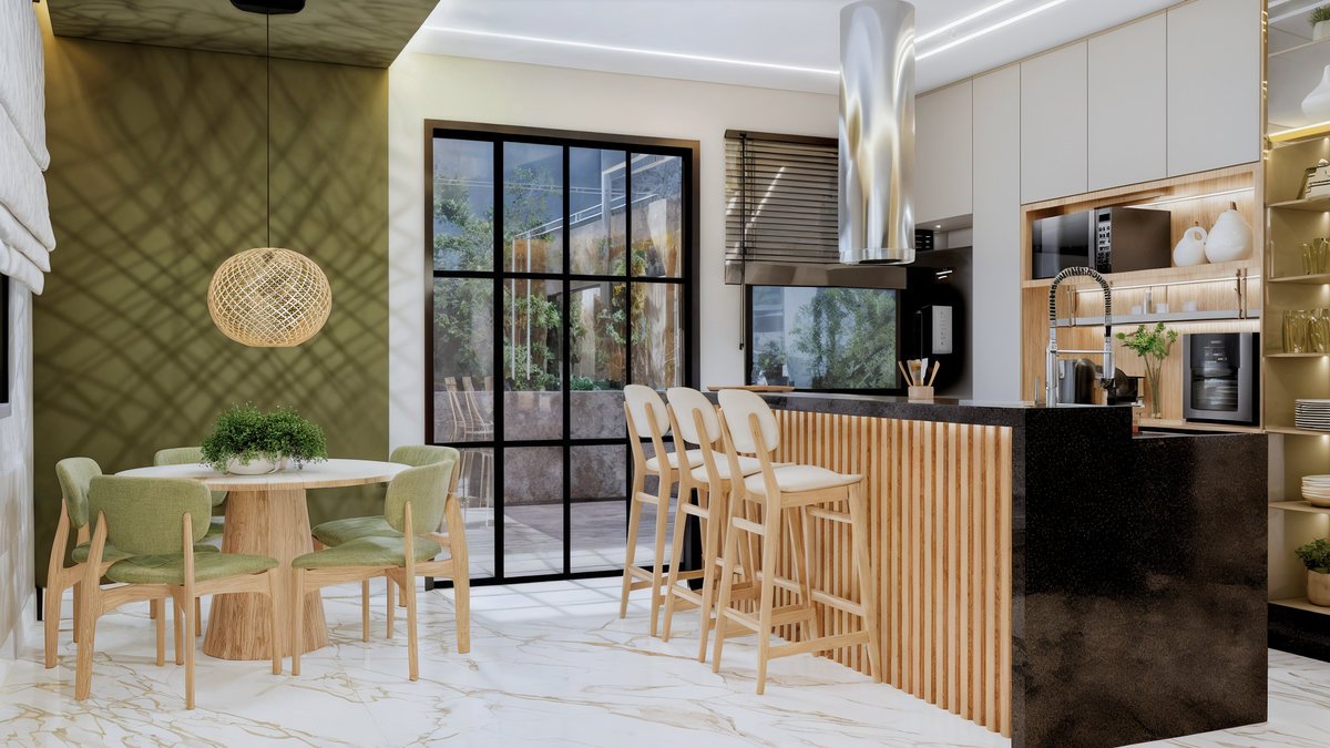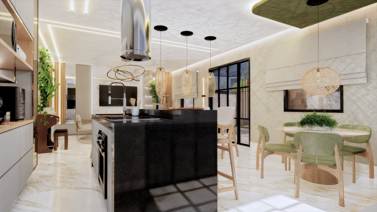 Este projeto de interiores valoriza a integração entre cozinha, jantar e estar criando um