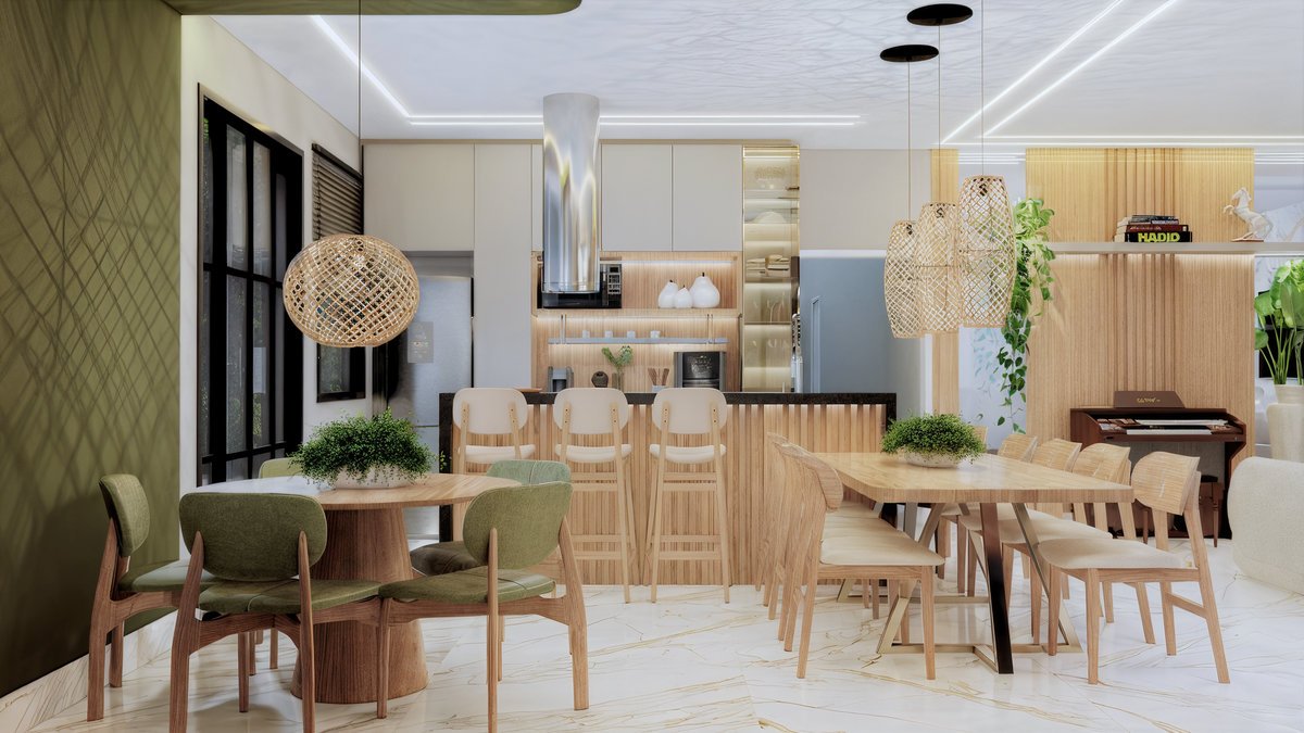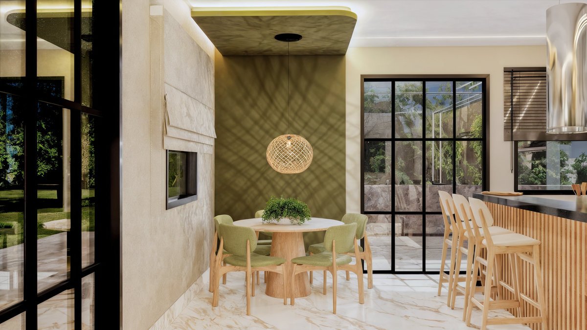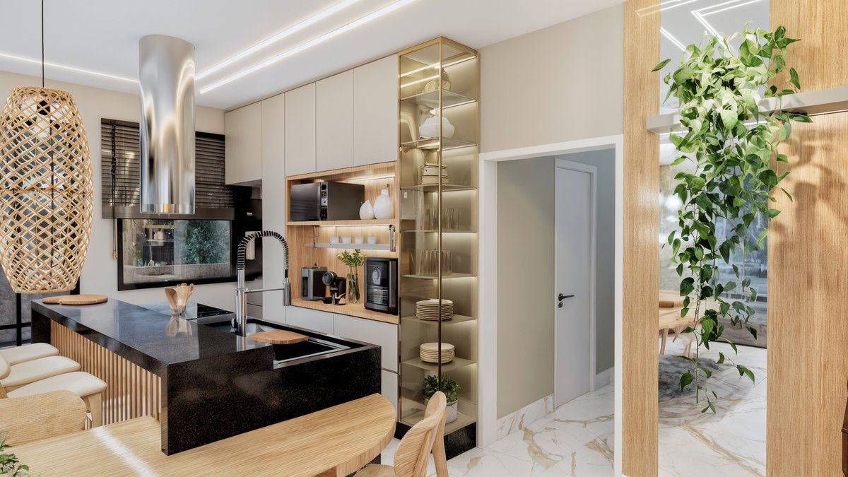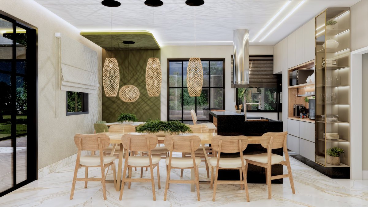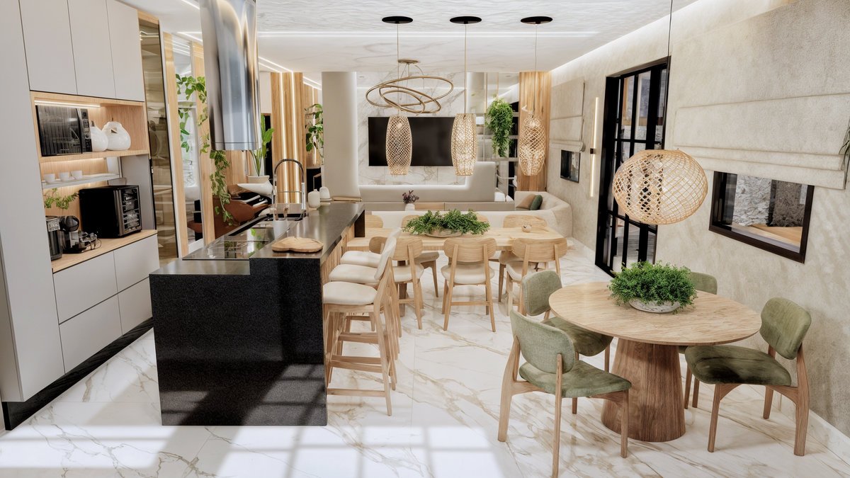Este projeto de interiores valoriza a integração entre cozinha, jantar e estar criando um