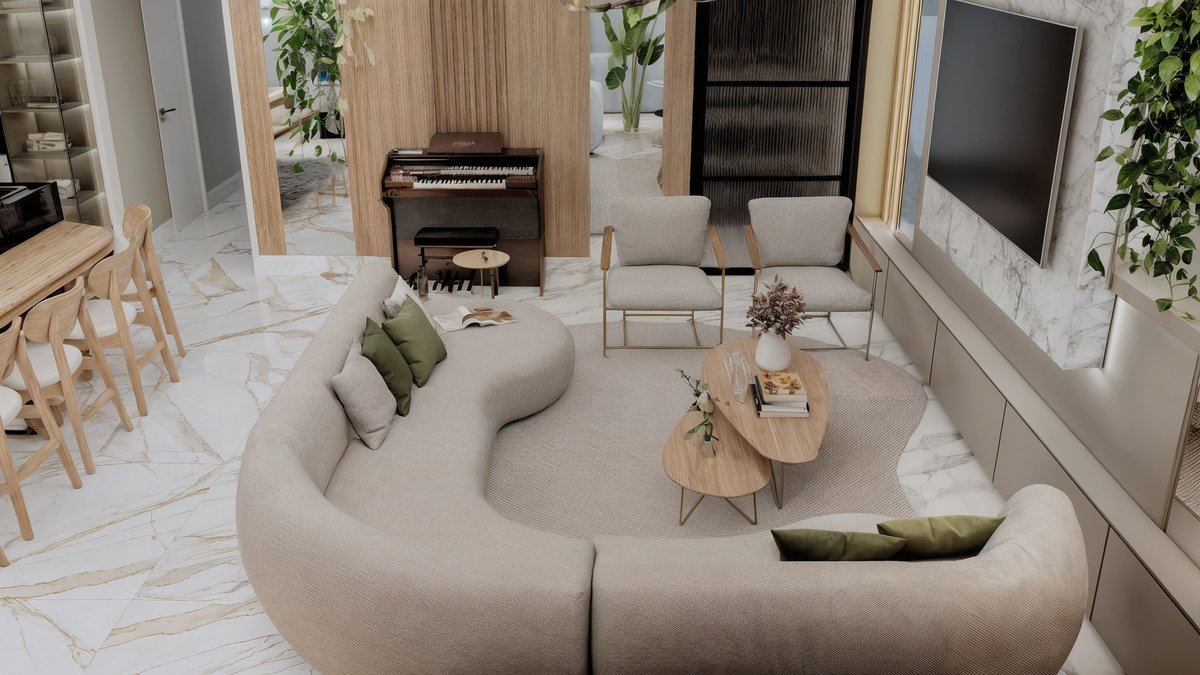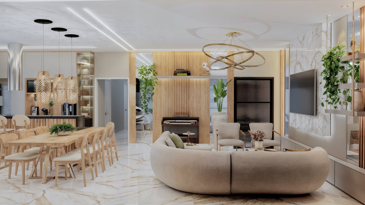 ambiente fluido, acolhedor e funcional. A paleta de tons neutros combinada ao uso de madeira
